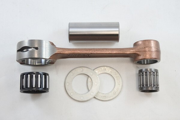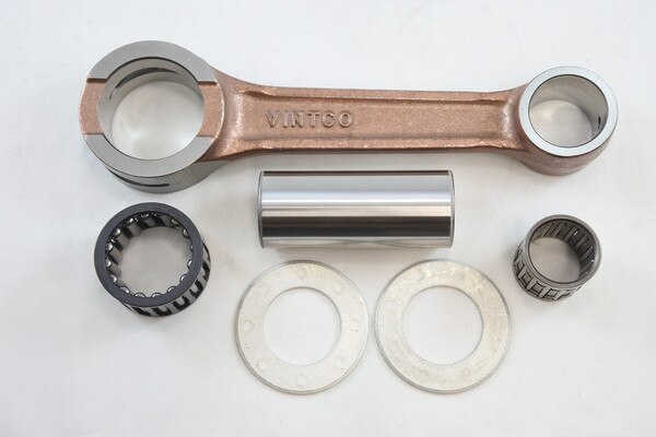 VintCo has all new Heavy Duty Connecting rod kits for your Vintage Kawasaki 250 Dirt Bike that will get you back on track. These Connecting rod kits will save you money over a new crankshaft. This Connecting rod kit fits Kawasaki KX250 1978-2008 KDX250 1980-84 91-94 KXT250 Tecate 1984-87 KXF250 Tecate 4 1987-88. All connecting rod dimensions/measurements are online with pictures. VintCo rod kits are manufactured with Heavy Duty Forged Steel and made with modern materials and manufacturing techniques to ensure an as good or better than OEM fitment and performance. Kit includes a rod, crank pin, big end bearing, wrist pin bearing, and two thrust washers. This newly manufactured connecting rod kit from VintCo will help you keep the ride going!